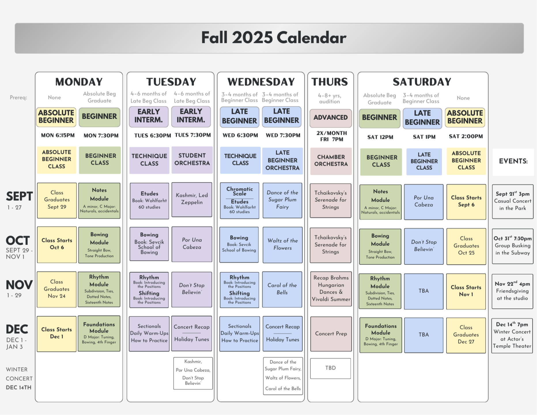 Our group classes go beyond the classroom. We build a community of musicians who learn and grow together, all through the beautiful journey of learning to play the violin. Many students form practice groups during and in between semesters to help them practice.